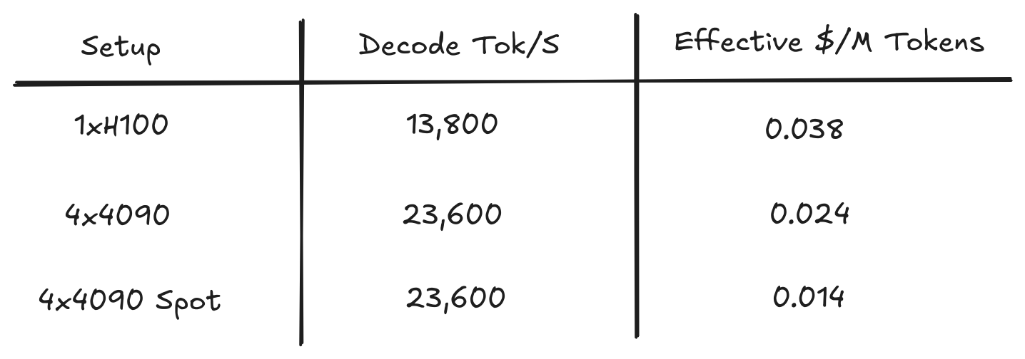 Next we send to both setups 500 concurrent requests and normalize the spend (4×4090s cost within a cent of 1×H100 per hour). This is where bandwidth-per-dollar shows up: the consumer stack pushes 23.6k decode tokens per second versus 13.8k on the H100 box. Translated into what you could charge to break even on the GPU spend, the 4090 cluster lands at $0.024 per million output tokens, compared with $0.039 for the H100.